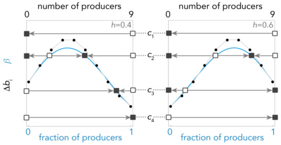 Types of dynamics when the benefit is a sigmoid function. The gradient of selection (continuous blue line) and its Bernstein coefficient Δbi (dotted line); squares show the equilibria (full: stable; empty: unstable) for different values of c (gray lines); arrows show the direction of the dynamics (determined by the sign of the gradient of selection); s = 5; n = 9, h = 0.4 or 0.6.