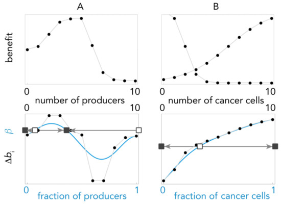 The problem with nonlinear public goods games is that they are hard to analyze. While games with concave and convex benefits can be studied analytically, and approximate results can be derived for games with threshold benefits, games with sigmoid benefits have been considered impossible to study analytically until recently [32]. Recent work on nonlinear public goods [33,34,35,36] has been applied to the production of diffusible molecules in cancer [37,38,39,40,41,42,43,44]. Some other recent models have used linear benefits [45,46].