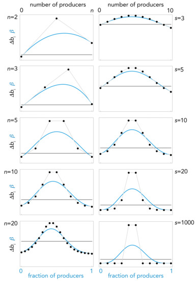 Many cases of nonlinear benefits can be modelled using the following function. The benefit b(i) for an individual in a group with a number i of producers and a number (n − i) of non-producers is described by