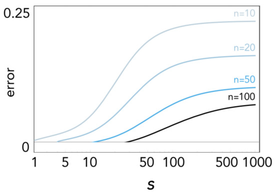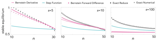 The error of the approximation Δb − is shown in Figure 6: convergence is slower as nonlinearity (s) increases (as we know from Voronovskaya’s theorem); it improves with n (an obvious consequence of Bernstein theorem) and as the equilibrium gets close to 1 or 0 (from the end-point values property of the Bernstein polynomials).