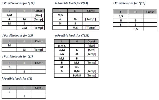 To solve our example we will use a heuristic called FFRO (for First Feasible Random Order) to load the vehicle at each stage. It does not appear in the academic literature, but is a real world option. For each set the packages are presented in random order and the agent loads them in a random cell, while obeying the size and temperature constraints. For any set of packages there is a well defined set of loads; shown in Figure 2; we show why (size or temperature) a possible load is infeasible. We assume the loader selects one of these with uniform probability, that is at random from the list. There is only one possibility for , two possibilities for , and four possibilities for . Note that the outcome on a smaller set does not constrain in any way the loading of a larger set, an important property of this heuristic.