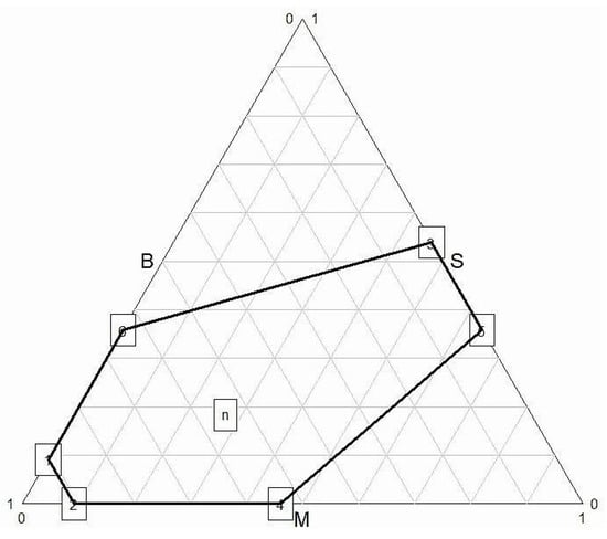 While the algorithm does not include calculating a core allocation, we could append a calculation of the nucleolus. In the case of three shippers, there is a closed form using the five step procedure of []. The nucleolus of the stable game from I with cost of 229 is (125, 62, 42) for (B, M, S); only one of the five cases from [] is relevant in any game with a core. A diagram of the core for three-player games can be made in a triangle plot, as in Figure 3, in which we also plotted the nucleolus, more or less central.