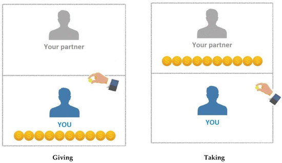 While the current study focused on giving and taking in the dictator game, it is uncertain if the reported findings extend to all other forms of active cooperation. For example, the aversion to taking over the willingness to give appears to be reversed in the public goods game, where contributions were higher under a giving rather than taking frame [22,76]. Future research should examine which factors, such as situational cues and norms (e.g., taking from a “common resource” in the public goods game vs. taking from another’s private property in the dictator game), produce these disparities across different forms of active cooperation.