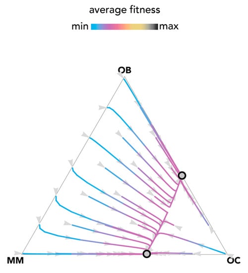 Bistability with linear benefits. The distance from each vertex is inversely proportional to the frequency of each type. Arrows show the direction of the dynamics; colors show the average fitness of the population. N = 10; cOC = 0.1; cOB = 0.2; cMM = 0.3; BOC,OC = 0; BOC,OB = 1; BOC,MM = 1.1; BOB,OC = 1; BOB,OB = 0; BOB,MM = 0; BMM,OC = 1.1; BMM,OB = −0.3; BMM,MM = 0; si,j→0.