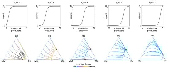 Bistability with nonlinear benefits. The top panels show the benefit function for different values of hi,j. In the bottom panels, the distance from each vertex is inversely proportional to the frequency of each type; arrows show the direction of the dynamics; colors show the average fitness of the population. N = 10; cOC = 0.1; cOB = 0.2; cMM = 0.3; BOC,OC = 0; BOC,OB = 1; BOC,MM = 1.1; BOB,OC = 1; BOB,OB = 0; BOB,MM = 0; BMM,OC = 1.1; BMM,OB = −0.3; BMM,MM = 0; si,j = 20.