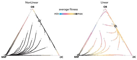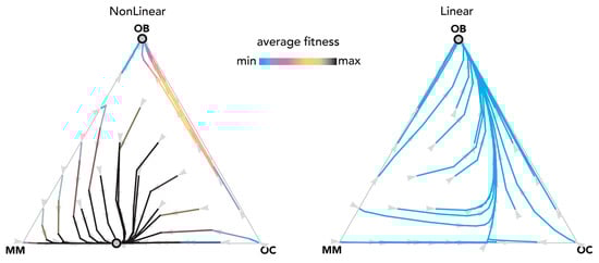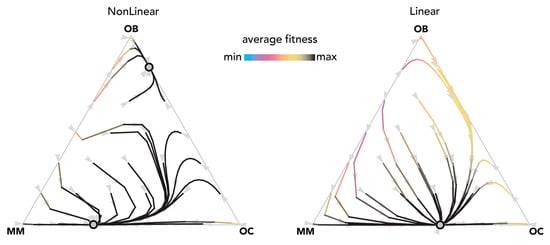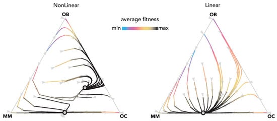 Nonlinear benefits and linear benefits can lead to similar dynamics. The distance from each vertex is inversely proportional to the frequency of each type. Arrows show the direction of the dynamics; colors show the average fitness of the population. N = 20; cOC = 0.1; cOB = 0.2; cMM = 0.3; BOC,OC = 0.55; BOC,OB = 1.1; BOC,MM = 0.6; BOB,OC = 1; BOB,OB = 0.5; BOB,MM = 0; BMM,OC = 0.8; BMM,OB = −0.5; BMM,MM = 1.5; hOC,OC = 0; hOC,OB = 0; hOC,MM = 0; hOB,OC = 0; hOB,OB = 0; hOB,MM = 0; hMM,OC = 0.3, hMM,OB = 0.02; hMM,MM = 0.1. Nonlinear: sOC,OC = 10; sOC,OB = 10; sOC,MM = 100; sOB,OC = 10; sOB,OB = 10; sOB,MM = 20; sMM,OC = 10; sMM,OB = 10; sMM,MM = 100; Linear: si,j→0.