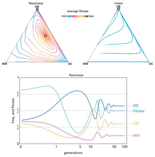 Nonlinear benefits can lead to an interior mixed equilibrium. The distance from each vertex is inversely proportional to the frequency of each type. Arrows show the direction of the dynamics; colors show the average fitness of the population. N = 20; ci = 0.1; BOC,OC = 0.45; BOC,OB = 0.9; BOC,MM = 2; BOB,OC = 0.9; BOB,OB = 0.3; BOB,MM = 0; BMM,OC = 2; BMM,OB = −0.3; BMM,MM = 0.9; hOC,OC = 0.05; hOC,OB = 0.05; hOC,MM = 0.5; hOB,OC = 0.05; hOB,OB = 0.05; hOB,MM = 0.5; hMM,OC = 0.5, hMM,OB = 0.5; hMM,MM = 0.5. Nonlinear: sOC,OC = 10; sOC,OB = 10; sOC,MM = 50; sOB,OC = 10; sOB,OB = 10; sOB,MM = 10; sMM,OC = 50; sMM,OB = 50; sMM,MM = 50; Linear: si,j→0.