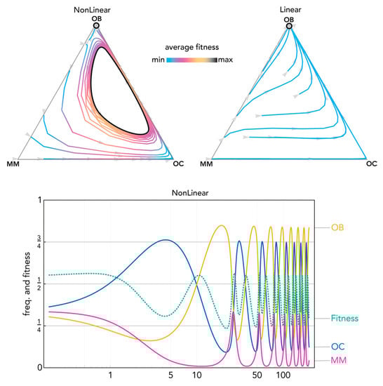 Nonlinear benefits can produce oscillations leading to an interior mixed equilibrium. The distance from each vertex is inversely proportional to the frequency of each type. Arrows show the direction of the dynamics; colors show the average fitness of the population. N = 10; cOC = 0.1; cOB = 0.12; cMM = 0.14; BOC,OC = 1; BOC,OB = 1; BOC,MM = 1; BOB,OC = 0.7; BOB,OB = 0.7; BOB,MM = 0.7; BMM,OC = 0.9; BMM,OB = 0.9; BMM,MM = 0.9; hOC,OC = 0.4; hOC,OB = 0.7; hOC,MM = 0.1; hOB,OC = 0.7; hOB,OB = 0.4; hOB,MM = 0.2; hMM,OC = 0.4, hMM,OB = 0.3; hMM,MM = 0.7. Nonlinear: sOC,OC = 20; sOC,OB = 20; sOC,MM = 5; sOB,OC = 10; sOB,OB = 10; sOB,MM = 50; sMM,OC = 10; sMM,OB = 5; sMM,MM = 5; Linear: si,j→0.