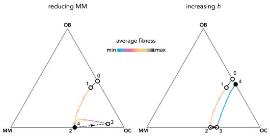 Therapies that target growth factors may be more effective than chemotherapy targeting MM cells. The distance from each vertex is inversely proportional to the frequency of each type. Arrows show the direction of the dynamics; colors show the average fitness of the population. Changes in frequency due to therapies that reduce the amount of MM cells (left) with constant hi,j = 0.3; or therapies that increase the value of hi,j from 0.3 to 0.7 (right). Circles show the original population before MM mutants arise (white), unstable states (gray), and stable states (black); colored curves show frequency changes driven by clonal selection; dotted black lines show frequency changes driven by therapy. At the OB–OC equilibrium (0), a mutant MM clone invades the population (1) and leads to an MM–OC equilibrium (2); if hi,j does not change, a therapy that reduces the fraction of MM cells (3, left) suddenly reduces the average fitness of the population, but the population immediately bounces back to the previous equilibrium (4, left). A therapy that increases hi,j to h*i,j (3, right) instead leads to a spontaneous extinction of the MM types and a reduction in fitness (4, right). Other parameters are: N = 10; cOC = 0.1; cOB = 0.2; cMM = 0.3; BOC,OC = 0; BOC,OB = 1; BOC,MM = 1.1; BOB,OC = 1; BOB,OB = 0; BOB,MM = 0; BMM,OC = 1.1; BMM,OB = −0.3; BMM,MM = 0; si,j = 20.