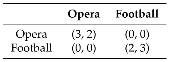 For non-zero-sum games and games with more than two players, while Nash equilibrium is still guaranteed to exist due to Nash’s result, none of these additional properties hold, as highlighted by the classic Battle of the Sexes Game depicted in Figure 1. This game has three Nash equilibrium strategy profiles: when both players select Opera (i.e., (Opera, Opera)), when both players select Football (Football, Football) and where both select their preferred option with probability . Clearly in this game the success of playing a Nash equilibrium depends heavily on the strategy chosen by the other player. For example, if the wife follows her strategy from the first Nash equilibrium and plays Opera, but the husband follows his strategy from the second Nash equilibrium and plays Football, the wife will receive the worst possible payoff of zero despite following a Nash equilibrium. While this example is just for a two-player game, the same phenomenon can occur in games with more than two players (though as described above, it cannot occur in two-player zero-sum games). Even three-player zero-sum games are not special, as any two-player general-sum game can be converted into a three-player zero-sum game by adding a “dummy” third player whose payoff equals negative the sum of the other two players’ payoff. Furthermore, even if we wanted to compute a Nash equilibrium, it has been proven to be PPAD-complete, and it is widely conjectured that no efficient algorithm exists [6], though several heuristic approaches have been developed for strategic-form games (i.e., matrix games such as Battle of the Sexes) with varying degrees of success in different settings [7,8,9,10,11]. There have also been techniques developed that approximate the Nash equilibrium to a provably very small degree of approximation error in a three-player imperfect-information game [12,13].