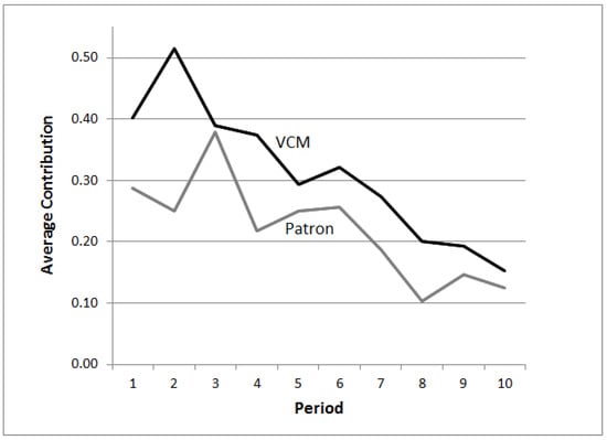 The Patron Game is not the first attempt to remove strategic interaction from a VCM. Reference [] introduce a treatment in which, after a Regular Condition à la [], every player is matched with a group of computers making predetermined and known choices. In this framework, subjects have no chance of benefitting themselves or other players by cooperating. Nevertheless, the average contribution in the Computer Condition (28.6%), although significantly lower than in the Regular Condition (52.8%), is surprisingly high. Both conditions show a decreasing pattern of contributions. Although the authors acknowledge that demand effects could confound the results, they attribute the observed behavior entirely to confusion, thereby implying that confusion can account for about half of the contributions. Using a similar design, Ferraro et al. [,] report lower contributions: 18% and 24% with human opponents and 9.6% and 12% with virtual players, respectively. These results confirm that approximately half of the contributions in a VCM are due to confusion and demand effects.4
