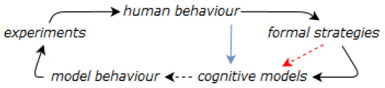 A diagram showing the elements involved in our research. Dashed arrows indicate automated processes. The red dashed arrow indicates our place in cognitive modeling research, as we aim to automate the creation of cognitive models from formal strategies. The blue line indicates the classical method of constructing cognitive models based on human behavior.