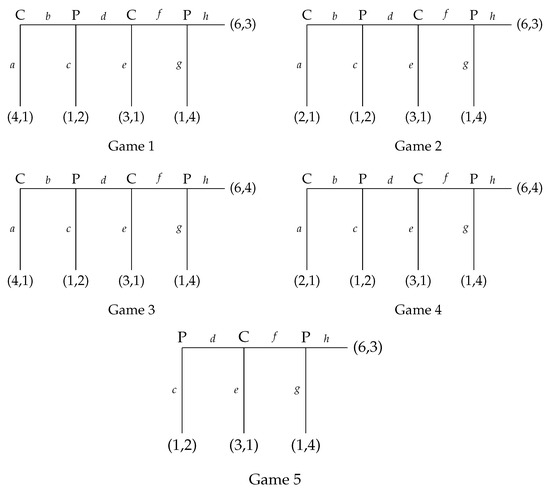 Our translation system has been developed based on centipede-like games, a particular kind of perfect-information games. The choice of these games is not a matter of necessity but rather of convenience. Since we wanted to make predictions about experiments such as those reported in [9,10] which are based on centipede-like games, we concentrate on these games—the games that we base our discussions on are provided in Figure 2. These games are similar to centipede games (cf. Game 2 in Figure 2) in almost all respects, the only difference being that, unlike centipede games, the sum of the points of players may not increase in the subsequent moves [22]. The logic presented in Section 2 deals with strategic reasoning in any perfect-information game, not just the centipede-like games that we discuss here, and the translation method would work in principle for any finite binary perfect-information game, with at most two choices at each decision point.