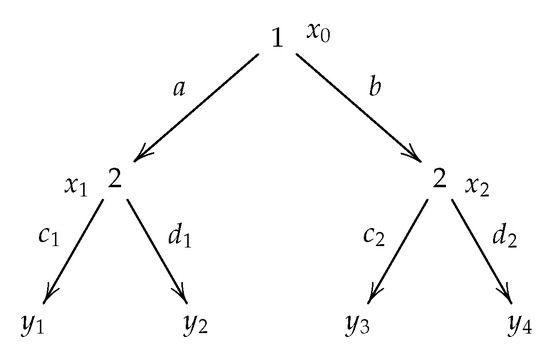 Before ending this section, let us give an example regarding what can be expressed by the strategy specification language in terms of reasoning of the players. Letting refer to the j’th decision node, the formula describes the following strategy specification for player P in any of the games , with k varying from 1 to 4, mentioned in Figure 2: If the current node is accessible from the root node by the move b and P believes at node in the game that after the action d from the current node action f will be played, then play d. We note here that in the subformula , the action symbol f is taken as a formula—one can do so by adding all the action symbols as special propositions with their semantics given in an appropriate way.