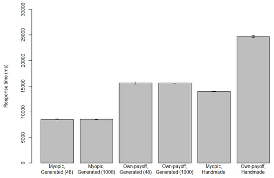 Response times for the automatically generated risk-based cognitive models in Game 4 can be found in Figure 9. The response times for the risk-based cognitive models follow the same general tendencies we have seen in those for other automatically generated cognitive models. The “participant, risk-averse” cognitive model is fastest, probably because it only has to verify one belief. All other cognitive models have to verify two beliefs per formula. The “participant, risk-taker” cognitive model is slowest, probably because it consists of two formulas where all other exhaustive formulas consist of one formula. The risk-averse cognitive model for C could be slightly faster than the risk-taking cognitive model for C, because verifying is less likely than verifying , but this difference could also be coincidental.