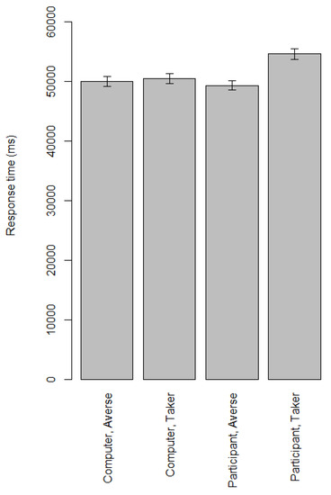 Reaction times in milliseconds for the automatically generated risk-based cognitive models in Game 4. “Computer-Averse”: the participant believes the computer is risk-averse in its decisions; “Computer-taker”: the participant believes the computer takes risks in its decisions; “Participant-Averse”: the participant says he/she avoids risks; and “Participant-Taker”: the participant says he/she takes risks.
