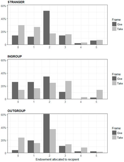 In contrast to the other settings, in-group interactions indeed vary from the commonly observed findings. Here, the results showed that framing the decision in a ‘give’ choice induces individuals to share lower amounts than in the neutral setting. Although this outcome appears counterintuitive, the literature on beneficial treatments of group members (group favoritism) also reports mixed results for the ‘give’ option in dictator games []. As a possible explanation, the group heuristic model states that altruism towards group members is regarded as a strategic action to gain access to a generalized exchange system []. Since the dictator game is a one-shot game, there is no reason to apply such strategic behavior. In addition, a post-analysis questionnaire analyzes whether varying the social context from a neutral to an in-group setting leads to a norm shift by eliciting the appropriateness of sharing behavior in a neutral setting and in within-group interactions. The result reveals that socially expected behavior in the two scenarios are identical, indicating that the social norm of sharing does not change when an in-group context is introduced. Furthermore, investigations by Winterich et al. [] provide an example of in-group discrimination in a donation decision. Their results suggest that a non-negligible share of participants donate more to out-group than in-group members. The decision of these individuals was mediated by an intent to include ‘Other’ in ‘Self’. Thus, higher donations to out-group members might be regarded as means of integrating another person. Related to the results, the reduced generosity to recipients in the ‘give’ choice prevent the allocations over ‘give’ and ‘take’ in in-group interactions to be significantly higher than in the neutral setting. Therefore, we do not find support for Hypothesis 2a.
