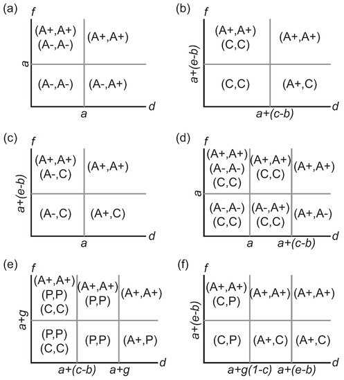 Parametric regions for pure Nash equilibria. Each parametric region admits a limited number of pure Nash equilibria. Panels (a–d) show the equilibria for games with strategies A−, A+, and C, while (e,f) use A+, C, and P. (a) , e, cytotoxic cells excluded; (b) , e. A− cells excluded; (c) , A− and C are naturally polymorphic with one another; (d) , A− and C are exclusionary in isolation; (e) and , P and C are exclusionary in isolation; (f) and , P and C are naturally polymorphic with one another.