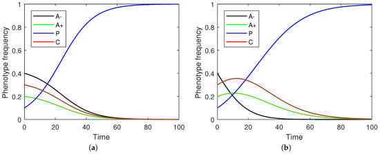 (a) Replicator dynamics in discrete time where proliferative cell dominates other strategies. Parameters: a, b, c, d, e, f, ; (b) Replicator dynamics in continuous time where proliferative cell dominates other strategies. Parameters: , , , , , , .