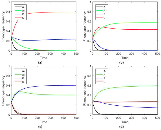 Equilibria between phenotypes under continuous replicator dynamics. In all figures: , . (a) Cytotoxic and proliferative equilibrium. Parameters: , , , , ; (b) Angiogenic and cytotoxic equilibrium. Parameters: , , , , ; (c) Proliferative and angiogenic equilibrium. Parameters: , , , , ; (d) Angiogenic, cytotoxic, and proliferative equilibrium. Parameters: , , , , .