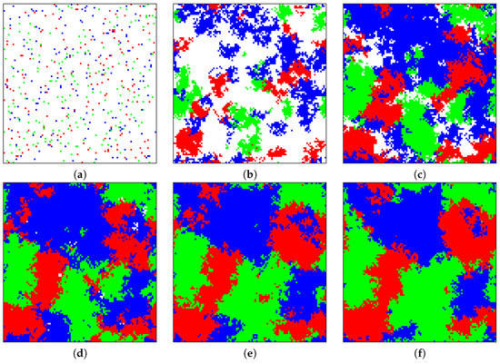 The evolution of the spatial game with A+, P, and C cells coexisting in equilibrium. Color code: white A−, green A+, blue P, red C. Parameters: , , . (a) Initial environment with 95% A− cells; (b–f) Snapshot of the environment after every 200,000 steps.