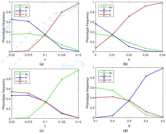 As part of our simulations, we also investigated how each of the parameters c, d, e, f, and g affects the final state of the tumor. We kept all parameters but the focal one fixed at the values corresponding to the three-way co-occurrence mentioned above. As the benefit from simple angiogenesis is agnostic to the recipient cell phenotype, the d parameter did not have a significant effect on the outcome of the spatial game save for a small albeit noticeable reduction in the equilibrium frequency of the P cells as the value of d is increased (not pictured). We surmise that this happens because the baseline reproduction advantage of P cells was relatively less important with larger values of d. Figure 5 shows the effect of varying the four remaining parameters of the spatial model on the final phenotype frequency distribution. As documented in the figure panels, these parameter variations can push the tumor towards a less heterogeneous state dominated by two or even a single phenotype.