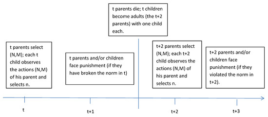Information Before selecting whether to follow the norm and punish, adults observe and , namely the mass of adults (from the previous generation) who punished norm deviators in the previous period, and the mass of norm-breakers in the previous period. They also observe the state of the world (l or h) and, in state h, they observe whether, for them, the punishing option is available or unavailable. The realizations of m and b in periods before the last cannot be observed.