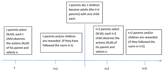 Overlapping Generations We consider an environment populated by overlapping generations. Each period t is characterized by a continuum of active parent-child pairs. Period t parents select to follow or not the norm, and to punish or not those individuals who broke the norm in the previous period. Period t children observe their parent’s behavior and decide whether to follow the norm. At , t parents and t children become purely passive and may be punished if they broke the norm in the previous period. Just before , t parents die. The t children observe the state of the world and recent history (more on this below) and become adults, i.e., the parents, with one offspring each.