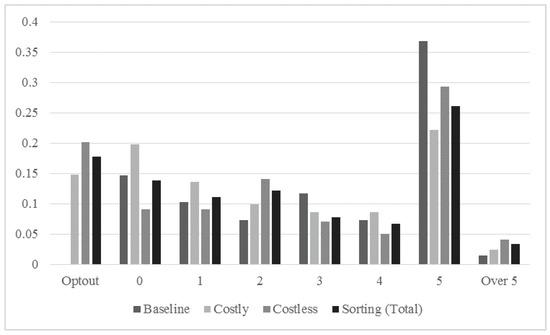 As such, this experiment necessitates a 2 × 3 design. The treatment cells are as follows: a standard (baseline) dictator game and two dictator games with sorting, costless and costly. In costless sorting, the dictator receives the same amount in entry and exit ($10). In costly sorting, the dictator receives $9 upon exit. These dictator games are all played across both anonymous and pictured sessions. The treatment cells and number of dictators that participated in each treatment are described further in Table 2, as well as in the data section below. There is no significant difference in the dispersion of participant decisions between treatments (Bartlett’s test, ).