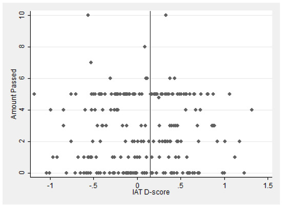 Scatter plot of IAT score and amount passed. Notes: The solid line indicates the IAT-D “bias” threshold of 0.15.