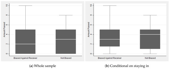 The above exercises held true when, instead of looking at the coarse measure of race of receiver, I looked at the finer measure of bias against one’s receiver. In Figure 4, I graph box plots for a further analysis of what happens when a dictator is biased against the race of the receiver. For these figures, that means both passing to a black receiver when biased against blacks () as well as passing to a white receiver when biased against whites ().