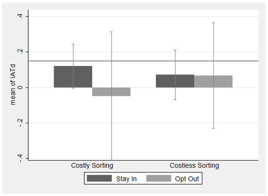 Perhaps the above results indicate that biased dictators are forward thinking with regard to these biases or otherwise self-aware enough to recognize their biases. If so, they may be simply choosing not to enter sharing environments where they can express this distaste or similarly choosing to express this distaste through their opting out. However, we see in Figure 5 the average IAT score for dictators in treatments with an exit option. Under costly and costless sorting schemes, the mean IAT score was descriptively smaller amongst those who stayed in (as compared to those who opted out), whereas in costless sorting, the mean IAT score was essentially the same. However, in both cases, this difference was not significant (costly: , ; costless: , ).