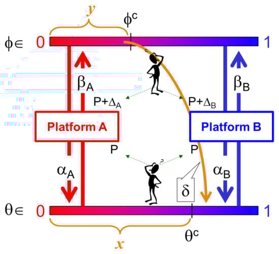 Under the context described above, we develop a stylized model as follows. Our demand model assumes that both users and suppliers are horizontally differentiated based on their preferences for two distinct platform versions a la Hotelling []. That is, a user (a supplier) is situated on an interval , and this location reveals his/her preferences for both platforms. Here, we employ () for the user index (the supplier index) representing his/her preference to the platforms. Without loss of generality, the left end point of the interval () is supposed to represent the user (the supplier) who most prefers A to B, while the right end point () represents the index of the player who most prefers B to A: that is, for the extreme platform-A-lover and for the extreme platform-B-lover. Following the convention of the Hotelling model, users are uniformly populated over the line segment. This normalization of the horizontal differentiation implies that our model focuses on the market share in each side. The same configuration is applied to the supplier side (refer to Figure 1).