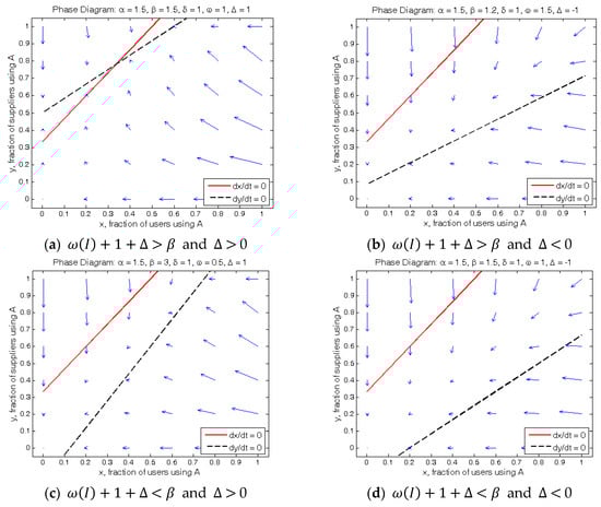 If there is an interior equilibrium , it will occur at the point where the market share of each platform coincides with the corresponding critical participant in both markets: that is, and . If the current market share and in the user side and in the supplier side) do not coincide, then there exist users (suppliers) whose payoffs can be raised by changing their choices: that is, switching to the other platform. If ), then users (suppliers) between and ( and ), who currently reside in platform B, would have been better off by switching to platform A. On the other hand, if (), then users (suppliers) between and ( and ) would have been better off by moving from A to B. Accordingly, it is natural to define the system dynamics as follows.