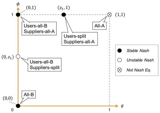 Proposition 2 suggests that we do not need to focus on all the possible boundary equilibria. Instead, it would be better to delve into only the stable equilibria for further consideration. The candidates are , , and . At the boundary equilibrium , all users and suppliers tip to the new platform B (see “All-B equilibrium” in Figure 3). On the other hand, at and , the two sides split into different platforms. In the former case, the user side tips to the advanced platform, while the supplier side remains at the legacy one. Thus, users use the new platform only for the legacy services at . In the latter, while the supplier side sticks to the legacy platform, the user side splits into two platforms. That is, there still remains some users () who are loyal and dedicated to the legacy platform. The context of horizontal differentiation in our demand model seems to play an important role in stabilizing the seemingly unreasonable equilibria— and —since there should remain a portion of users who prefer the new platform to the legacy one. If we had developed the demand model on the basis of the vertical differentiation, then these equilibria would have been unstable.
