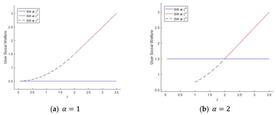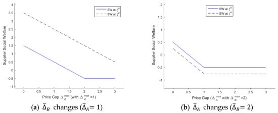 In both side, SW’s at the all-new-platform equilibrium () are always lower than the ones at the completely separated equilibrium (). In the case of small and (Figure 4a and Figure 5a), both SW’s at are inferior, even to those at the partially separated equilibrium (). These outcomes result from the characteristics of the equilibria. For example, since the suppliers joining the advanced platform should pay the extra charge (), suppliers’ SW at are liable to be poorer than those at and , where the suppliers join the current platform without the extra charge. In terms of the user side, the combination of and determines the relative advantage of the all-new-platform equilibrium. For a small and a big (Figure 4a), the users locked in the all-new-platform equilibrium suffer from frustration of their chance to make the most of the backward compatibility. On the other hand, with a big and a small (Figure 4b), users’ SW outperforms that of the partially separated equilibrium thanks to the strong indirect network effect.