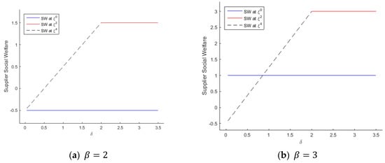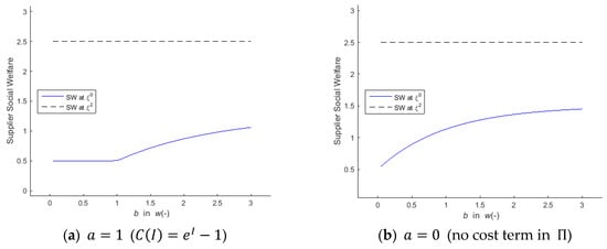 Note that platform provider’s investment alleviates not only the burden of operating the new platform () but also the congestion effect () in the supplier side. With the functional forms of and employed in the experiments above, the investment efficiency is determined by the parameters like , , and . It does not affect users’ SW but suppliers’ SW at (it does not affect suppliers’ SW in the separate equilibria— and —either, since no suppliers join the new platform there). We try various values for with and fixed at some values. Thus, as increases, shrinks, thereby improving the investment efficiency (i.e., reducing the congestion effect for the suppliers). Figure 6 shows the increase of suppliers’ SW in the all-new-platform equilibrium as the efficiency enhances (here, SW at (the dashed line) are drawn just for reference). In Figure 6a, we employ the same and as ones in the previous experiments; in Figure 6b, we eliminate the cost term in platform provider’s profit function, which implies an operation cost of zero.