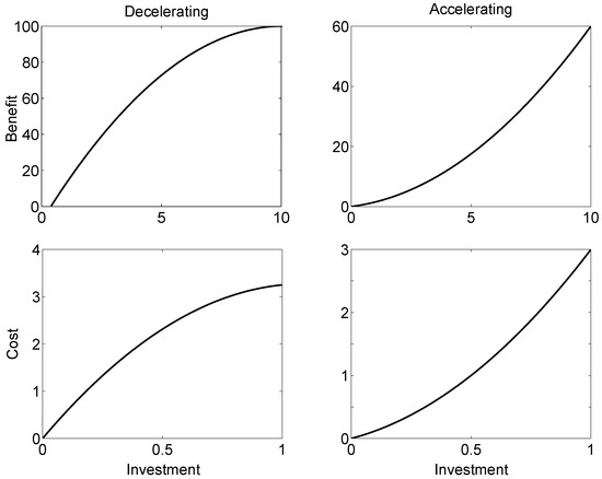 Examples of cost and benefit functions. Parameters used are for decelerating benefit = −1, ; for accelerating benefit ; for decelerating cost ; and for accelerating cost . In choosing the horizontal range for the plots of the benefit functions, we have assumed .