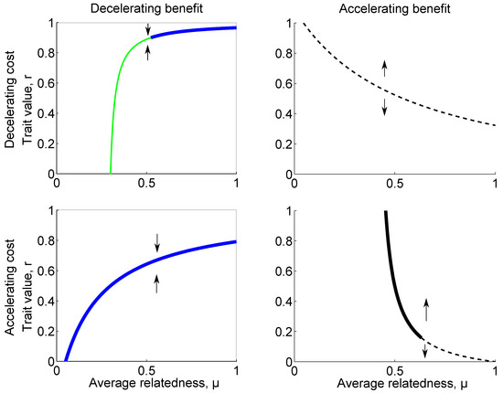 From Equation (6) we see that the denominator is positive if and only if the interior singular strategy is convergence stable. Since the benefit function is strictly increasing, we conclude that increased relatedness has opposite effect on interior singular strategies depending on whether they are evolutionary attractors or repellers. As illustrated in Figure 2, evolutionary attractors increase with relatedness while evolutionary repellers decrease with relatedness.