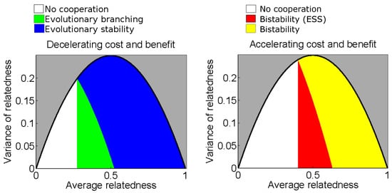 If B is decelerating, then implies evolutionary stability, and if B is accelerating, then implies evolutionary stability. For to equal implies , that is, with maximum variance (see Appendix A.2), convergence stability and evolutionary stability switch at the same time. Assuming on the other hand that , this would imply which is not possible (see Appendix A.2). In other words, evolutionary stability will switch as soon as or after convergence stability switches when increasing the average relatedness, depending on whether the variance is at its maximum or not.