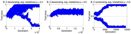 Simulations using group size , and B and C both decelerating or both accelerating. As predicted by the analytical investigation, when B and C are decelerating, the population undergoes evolutionary branching when , and it reaches evolutionary stability when . When B and C are accelerating, bistability occurs when . In all three cases, .