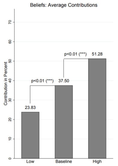 Further evidence on the proposed mechanism comes from investigating the pairwise correlation between contributions and stated beliefs in each treatment. If a sufficient number of individuals hold preferences for conformity, there should be a positive correlation between the perceived norm and actual behaviour. This is true for each of the treatments with correlation coefficient ranging from () in BASE and () in LOW to () in HIGH.