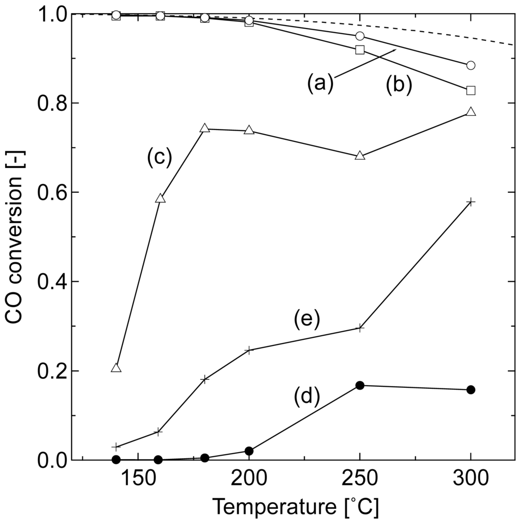 These results reflect the reaction system of WGS using an Au/iron oxide catalyst; the catalytic activity is caused by small Au particles activated by synergism with the support at low temperatures, gradually shifting to be support-dependent at high temperatures [20]. The catalytic activity of gold is diminished by the agglomeration of Au particles with the increase in reaction temperature. On the other hand, the reaction involves the reduction of Fe2O3 to Fe3O4 phase, which is a catalytically active oxidation state [19,20] The shift in catalytic activity from Au-dependent to iron oxide dependent is clearly seen in the conversion curve of 1 wt% Au catalyst that showed low conversion of CO at 140 °C because of the low content of Au. The catalytic activity of Au increased with temperature up to 180 °C and then decreased due to the agglomeration, while the active site shifted to iron oxide at around 250 °C, leading to the increase in conversion at 300 °C.