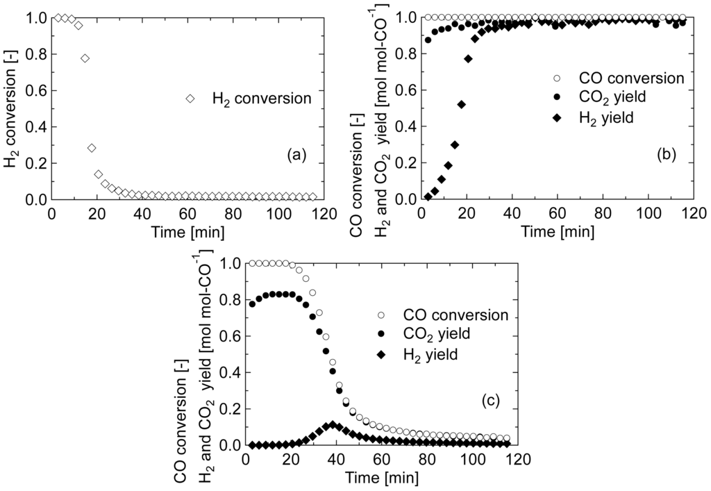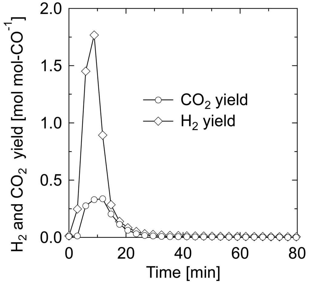 Figure 8 shows the result of 80 °C WGS using non-reduced Au/Fe2O3 catalyst. Although high conversion was obtained at the initial stage of the reaction, appropriate amounts of H2 were not produced, which is similar to the reaction behavior observed during CO pre-reduction (Figure 2(c)). This indicates that the WGS cycle, which is promoted by redox transfer between Fe2+ and Fe3+, did not occur despite the presence of H2O in the reactant. CO conversion and CO2 yield show that the reduction of iron oxide progressed, but the low yield of H2 shows that the catalyst was inactive for dissociative adsorption of H2O. The reduction of iron oxide by CO was caused by high activity of Au nano-particles for adsorption of CO. In fact, Silberova et al. [32] found with DRIFTS study that the conversion of CO to CO2 on Au/Fe2O3 catalyst occurs even at a room temperature through the decomposition of the carbonate species. Meanwhile, low activity for the dissociative adsorption of H2O observed in this non-reduced catalyst shows that the site on iron oxide to activate Au for the reaction, “□”, was not formed. This is possibly due to a low crystallinity of the iron oxide support resulted from the low reaction temperature. In the case of Fe2O3-ZnO and Fe2O3-ZrO2 catalysts, Au on the crystallized metal oxide was more active compared to the one on amorphous metal oxide for WGS [33]; therefore, it is believed that the site for dissociative adsorption of H2O cannot be formed on amorphous iron oxides. Similarly to CO oxidation using gold catalysts, where the rate-determining step is the activation of oxygen [34], it is important to activate the catalyst for the dissociative adsorption of H2O. The Au/iron oxide catalyst employed here, thus indicated, can have high catalytic activity for low-temperature WGS only when appropriately reduced and crystallized before the reaction.