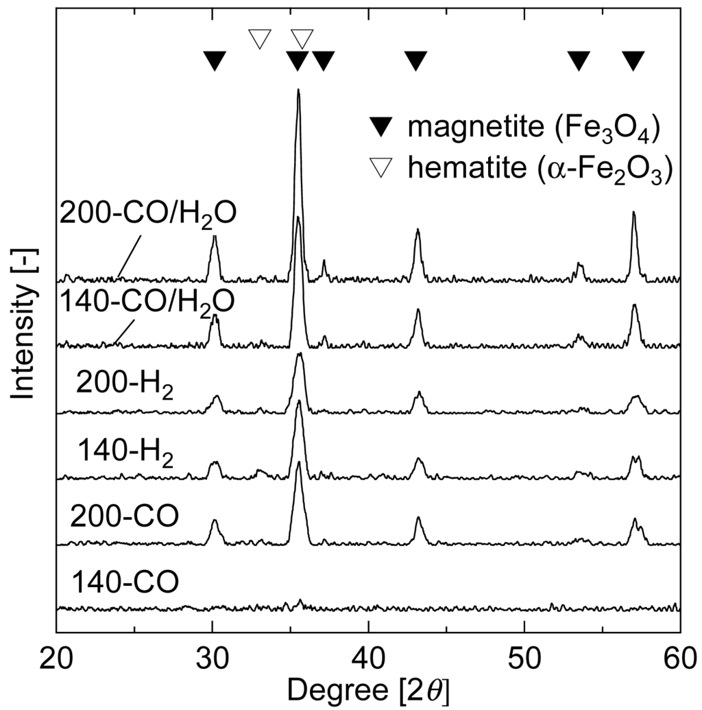 The reduction temperatures employed were 140 and 200 °C. As reducing gases, CO and H2 were used because they are possible reactants involved in WGS to reduce iron oxide, and CO/H2O was also used as a WGS condition. Using these conditions, the pre-reductions were conducted for 2 h, producing six kinds of reduced samples. The reduced catalysts were represented by reduction temperature and reducing gas, e.g., 140-CO.
