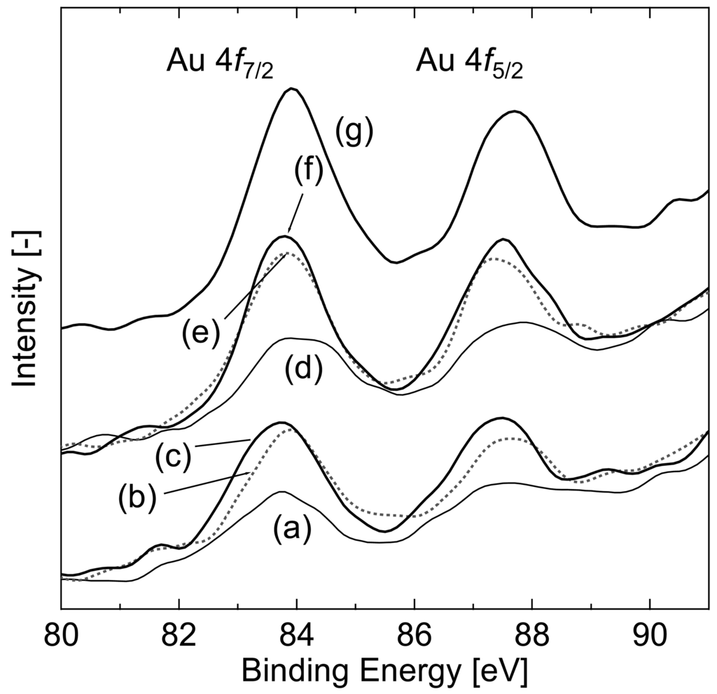 - Radnik, J.; Mohr, C.; Claus, P. On the origin of binding energy shifts of core levels of supported gold nanoparticles and dependence of pretreatment and material synthesis. Phys. Chem. Chem. Phys. 2003, 5, 172–177. [Google Scholar]