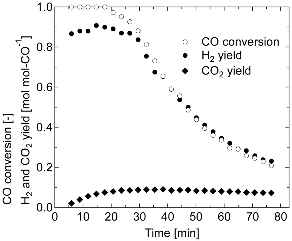 The effluent gas from the reactor was diverted through a cold trap to remove H2O, mixed with an Ar flow of 50 mL min−1 for dilution, and then analyzed using an on-stream gas chromatograph (VARIAN, CP-4900 Micro-GC) equipped with a thermal conductivity detector and two columns, a Molsieve 5A and a PoraPLOT Q. Analytical values were expressed as the conversions of CO and H2, and the yields of CO2 and H2. The conversions were calculated from the ratio of the inlet and outlet molar flow rates as 1 – Foutlet/Finlet, where F stands for the molar flow rate of CO or H2. The yields were obtained from the ratio of the outlet molar flow rate of CO2 or H2 over the inlet molar flow rate of CO.