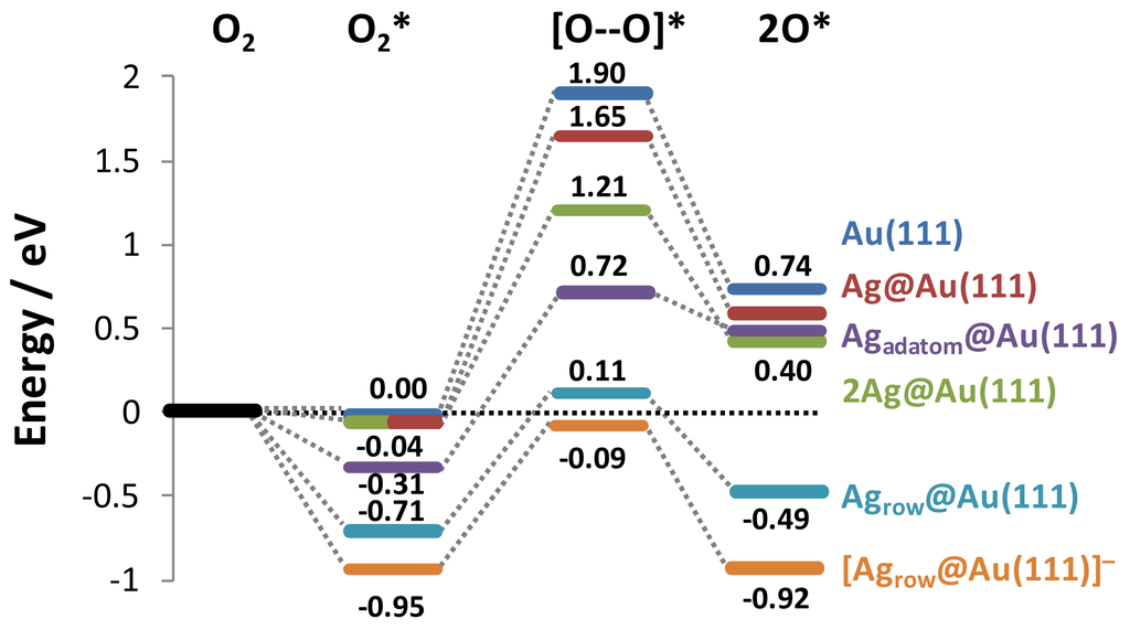 In the case of the oxygen dissociation reaction, it is found that the low coordinated atoms considerably decrease the activation energy barrier for this reaction: the barrier of 2.23 eV calculated for the flat Au(111) surface [46] is strongly reduced to 1.16 eV on the Au(221) surface [46], to 0.93 eV on the Au(211) surface [46], to 1.00 eV on the Au(321) surface [20] and even to lower values if the reaction is considered on gold nanoparticles [21]. However, these activation energy barriers are quite high to confer a superior activity to some gold based catalytic systems as the nanoporous gold used in the methanol oxidation [22]; in fact, the authors attributed the high performance of this catalytic system to the presence of residual silver on the nanoporous gold. Following this experimental evidence we carried out a systematic work to check how the doping with silver atoms affects the catalytic activity of extended gold surfaces for the O2 dissociation [23]. We found that increasing the silver content of the gold surfaces significantly affects the catalyst activity for the O2 dissociation (please see Figure 1 which illustrates the effect of the Au(111) surface doping in the catalytic activity). The pure gold surfaces as the Au(111), Au(110) or Au(321) present activation energy barriers for the O2 dissociation of 1.93 eV [23], of 0.85 eV [23], and of 1.00 eV [20], respectively. The activation energy barrier decreases up to a value of 1.27 eV in the case of the flat Au(111) surface doping and even up to a value of 0.86 eV considering silver rows deposited on the Au(111) surface. In the case of the doped Au(110) surface, the activation energy barrier decreases up to a value of 0.59 eV which is very close to the calculated value for the activation energy barrier on the pure Ag(110) surface, e.g., 0.52 eV [23]. In the case of the Au(321) surface, possessing atoms in the step region with coordination numbers lower than those in the Au(110) surface, the doping with silver atoms decreases the activation energy barrier up to 0.89 eV [23]. Therefore, it seems that the catalytic activity for the O2 dissociation of the gold surfaces doped with silver atoms may be enhanced by the presence of low coordinated atoms leading to high reactivity catalytic systems toward this dissociation reaction.
