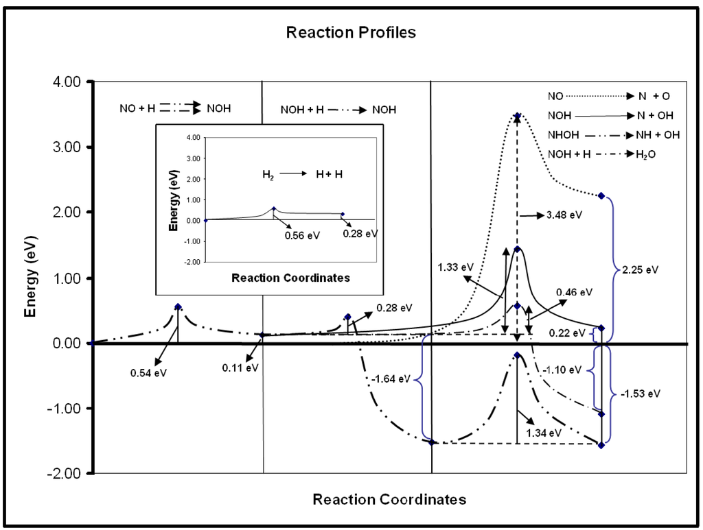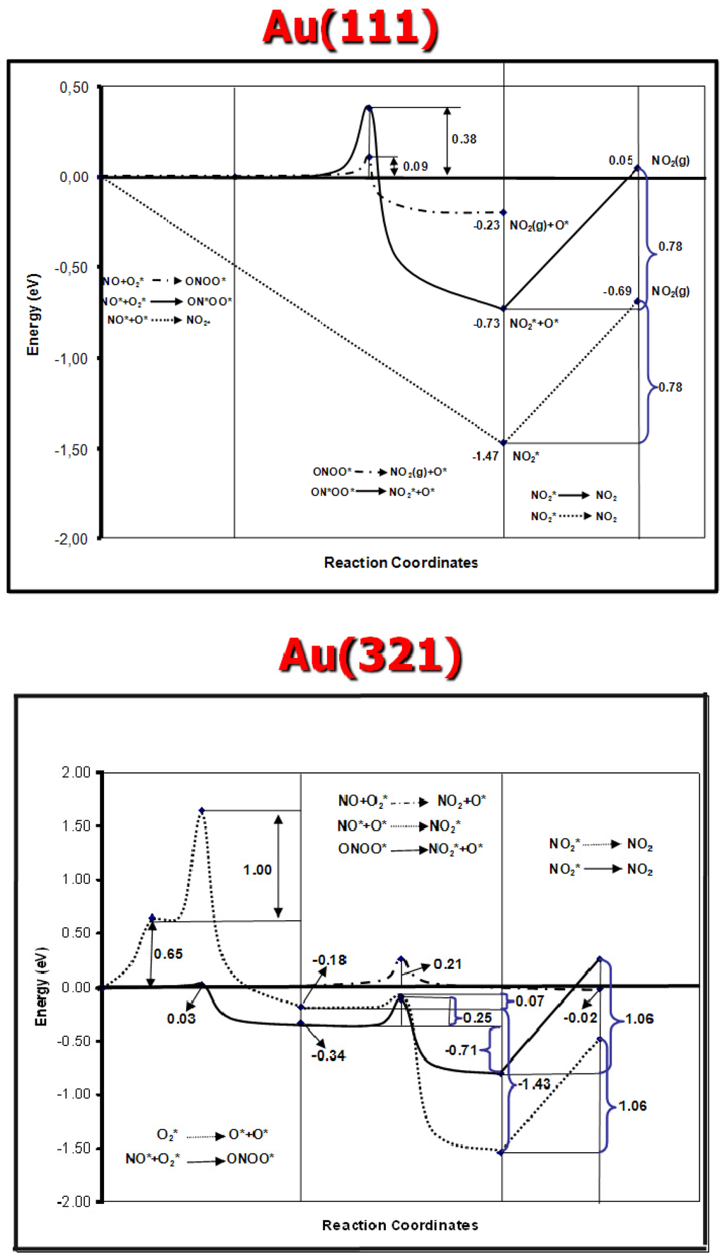 It is worth mentioning in this work the reactions of NOx oxidation or reduction. These types of reactions are vital in the elimination of NOx species from the automotive exhaust gas emissions due to the dramatic environmental problems caused by these gases [24]. This is of global concern and important efforts are being made to fulfill the pertinent normative implemented [25]. The catalytic reduction of these oxides to molecular nitrogen follows one of two generic schemes: Selective Catalytic Reduction (SCR) [26] or NOx Storage-Reduction (NSR). The SCR scheme consists of the direct reduction of NOx species on the catalyst and it is habitually employed in stationary NOx sources, needing a reducing agent: urea, ammonia or hydrocarbons (from the fuel). In the NSR method the NOx species are reduced along two cycles where the combustion in the engine runs alternately over long oxygen-rich and short fuel-rich periods; in the oxygen-rich regime, the NOx species are oxidized to be captured and stored. Then, in the fuel-rich cycle, the NOx species are reduced to N2 on pure noble metal or bimetallic alloys including a noble metal [27,28]. In order to understand and to improve these processes a series of research works have been recently carried out, several of them focused on the NO oxidation [29–33] or the NO reduction on gold based catalysts [34–39]. From the results of these works, it can be suggested that the cleaving of the N–O bond is a crucial step in the NOx reduction to N2, especially at low and moderate temperatures. It was found that the reaction of NO dissociation on a stepped gold surface would be easier if atomic hydrogen was available on the catalyst surface. Surface hydrogen adatoms were found to react quite easily with NO and the N–O bond dissociation was much more facile in the case of hydrogenated species [40]. The hydrogen dissociation on the stepped Au(321) surface was found to be limited by a moderate activation energy barrier. The activation barrier can be visibly reduced on other gold based catalysts such as gold nanoparticles [41] or supported gold nanoparticles, e.g., Au13/TiO2 [42] and Aux/TiC [43,44]. Very recently, the oxidation of alcohols to aldehydes was found to be affected by the surface roughness which was modeled by the consideration of flat and stepped surfaces, rod and Au38 nanoparticle as gold catalysts models [45].