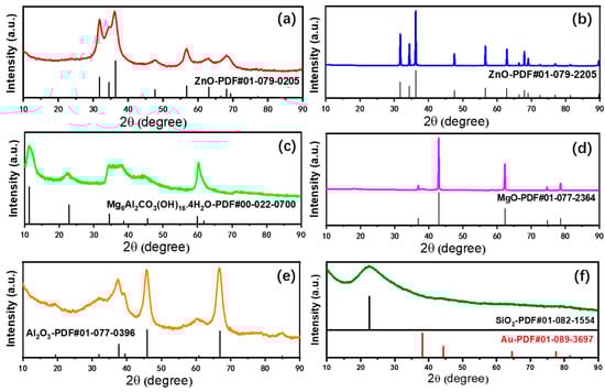 The structural properties of the supported Au25 NCs catalysts and the corresponding supports were evaluated from X-ray diffraction (XRD) measurement (Figure 2 and Figure S1). From the XRD patterns, all the catalysts and supports after calcination displayed the specific structure of the precursor or metal oxides. This means that the preparation of six different supported gold catalysts was successful. As showed in Figure 2a, the diffraction peaks could be identified from the order of the ZnO phase, which was similar with the structure of ZnO in Figure 2b. It implied that the ZnAl-hydrotalcite had transformed into the atomic mixed oxide after calcination. In addition, the same phase between the supports and the catalysts in Figure 2 and Figure S2 suggested the adsorption of gold into the supports had not changed the structure. Figure 2c showed the diffraction peaks of MgAl-hydrotalcite and MgO. Based on the previous study [], the calcination temperature of 300 °C might not be enough to transform the hydrotalcite into the complete magnesium oxides, while, at this temperature, the MgAl-hydrotalcite supported gold catalysts could display good performances in different reactions [,]. In addition, the gold catalysts calcined at the same temperature was imperative for comparison of the different gold catalysts, since the size distribution largely depends on the heat treatment temperature [,]. Subsequently, Figure 2d shows the intact phase structure of MgO, which maintained the originate state of the supports. The diffraction peaks in Figure 2e could be ascribed to the structure of γ-Al2O3 []. Due to the low temperature of thermal decomposition, the precursor of Al(OH)3 dehydrated and transformed to the γ-Al2O3 instead of the α-Al2O3 [], the latter was generally utilized for the corundum. Figure 2f displayed a broad peak at 22.5°, which was assigned to the amorphous SiO2 []. In addition, no diffraction peaks of gold appeared on all the catalysts. This was caused by the low loadings of gold.